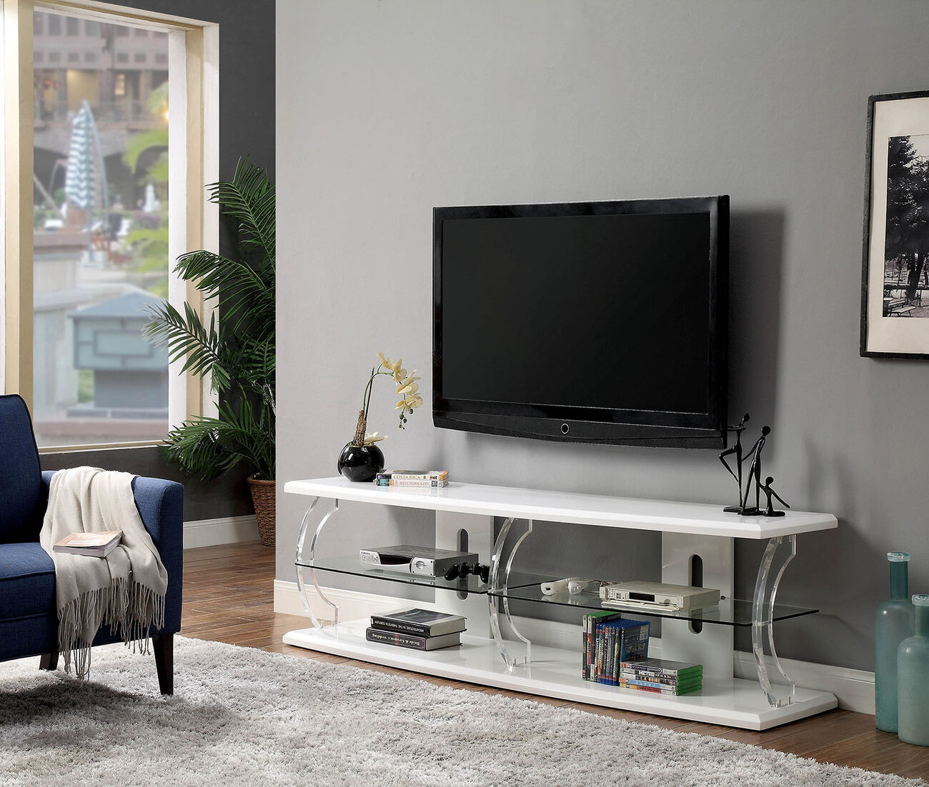 60-inch Wooden TV Stand With Spacious Glass Shelf, White And Clear