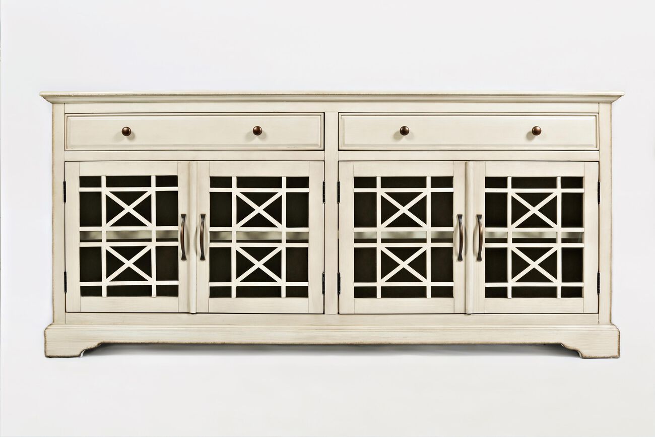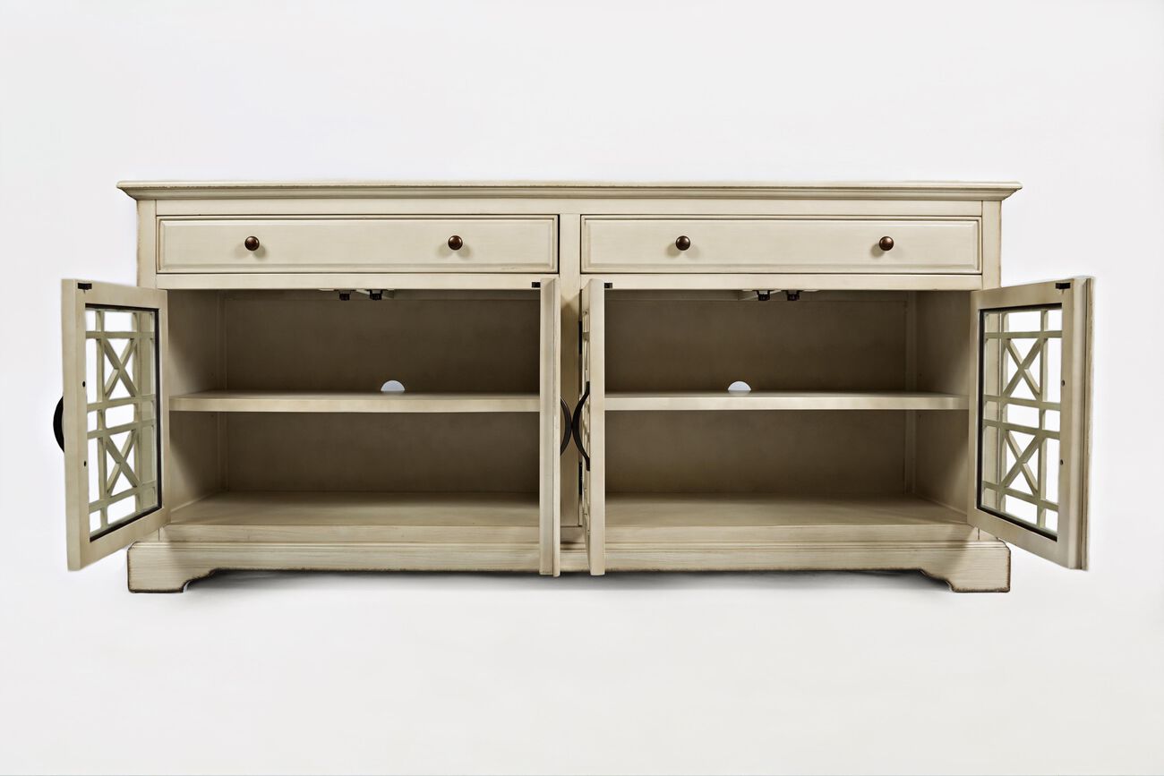 Craftman Series 70 Inch Media Unit with Fretwork Glass Front, Antique Cream