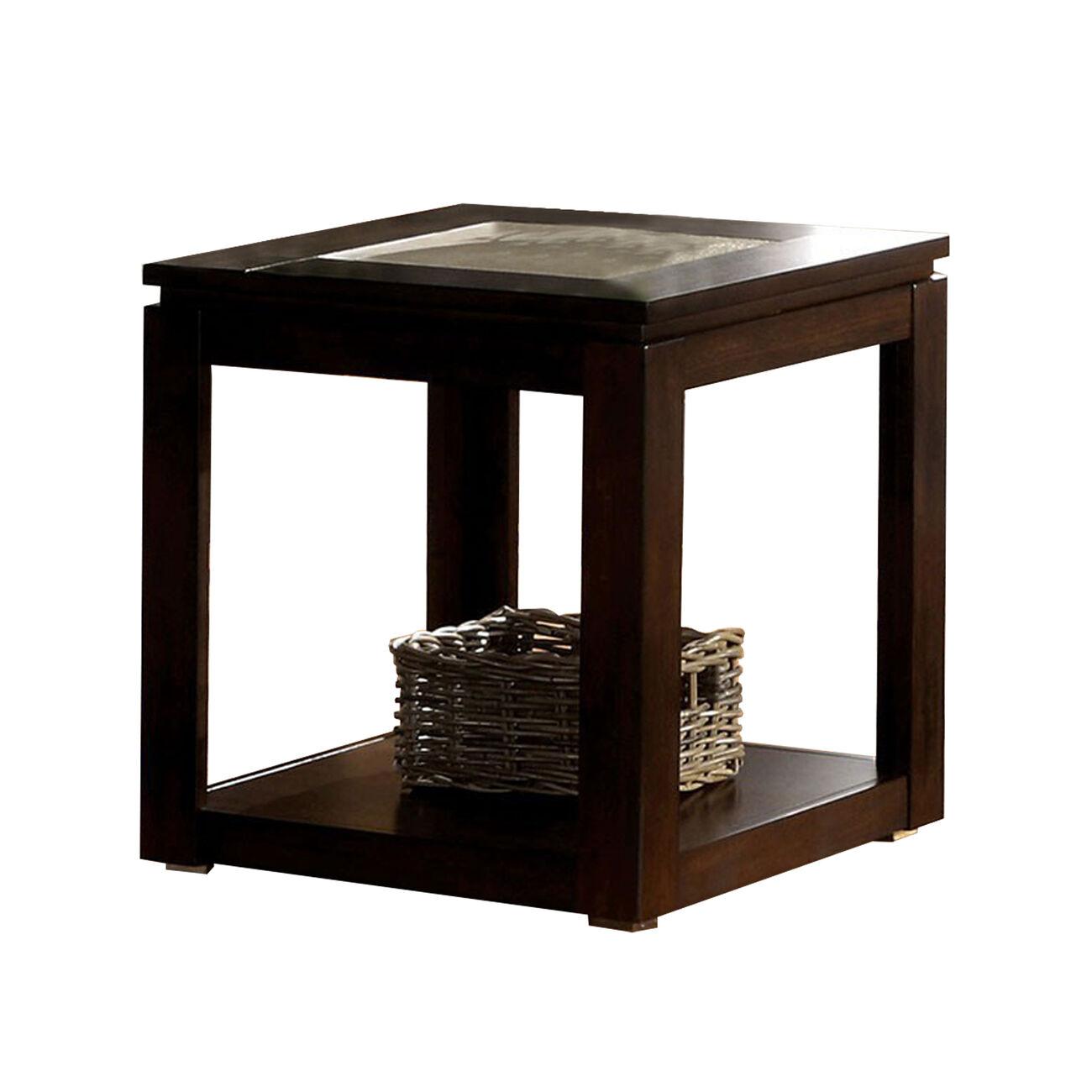 Form and function are hallmarks of this occasional end table. This table has a contemporary tile insert design on the top and extra open shelving on the bottom. Finished in deep espresso, this end table will certainly impress all your guests and visitors.
