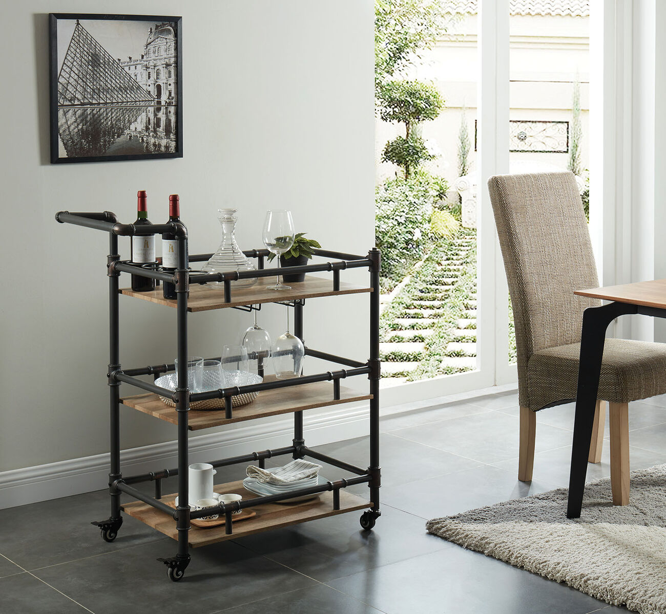 Perfect for house parties, this cart offers three wooden tiers to place food trays, glasses, bottles and cutlery. For easy movement, this pipe inspired metal serving cart sports casters with lock along with a handle. Finished in a brown and black color, this cart is designed to save space while offering ample storage option. Dimension:18 3/4wl x 35 5/8dw x 39 7/8h