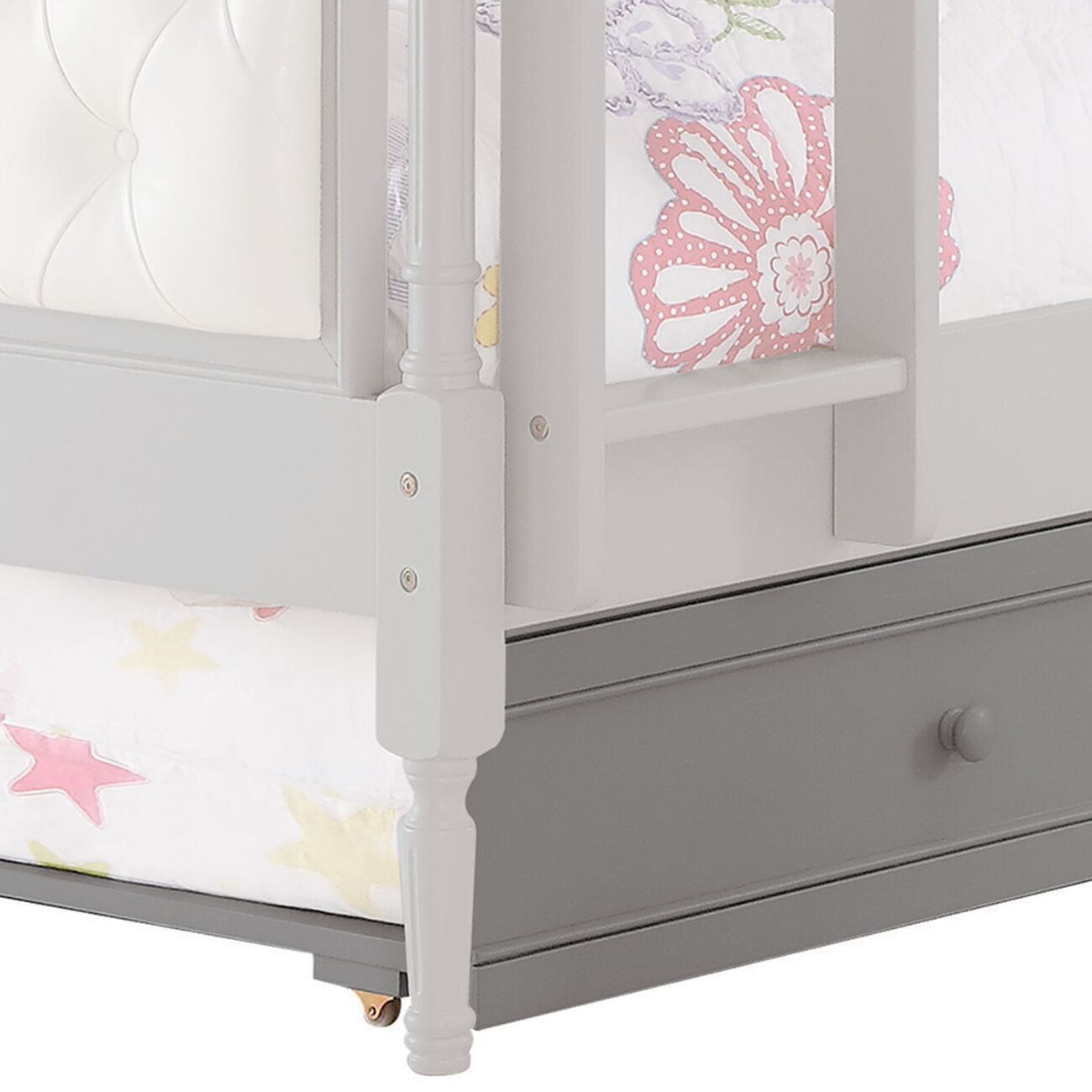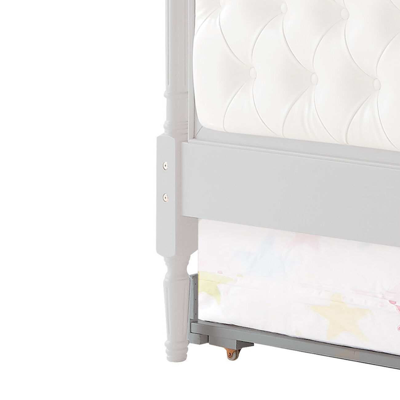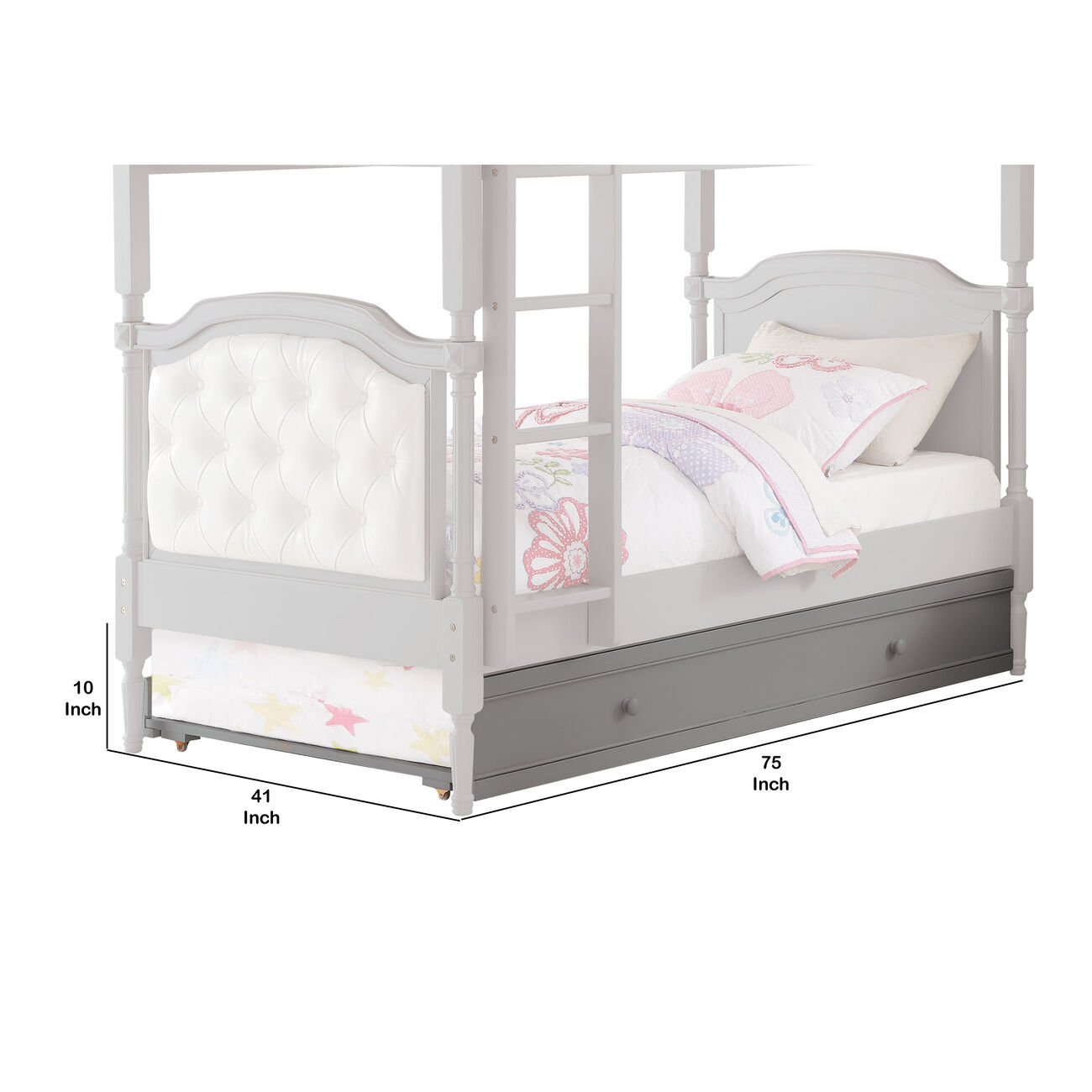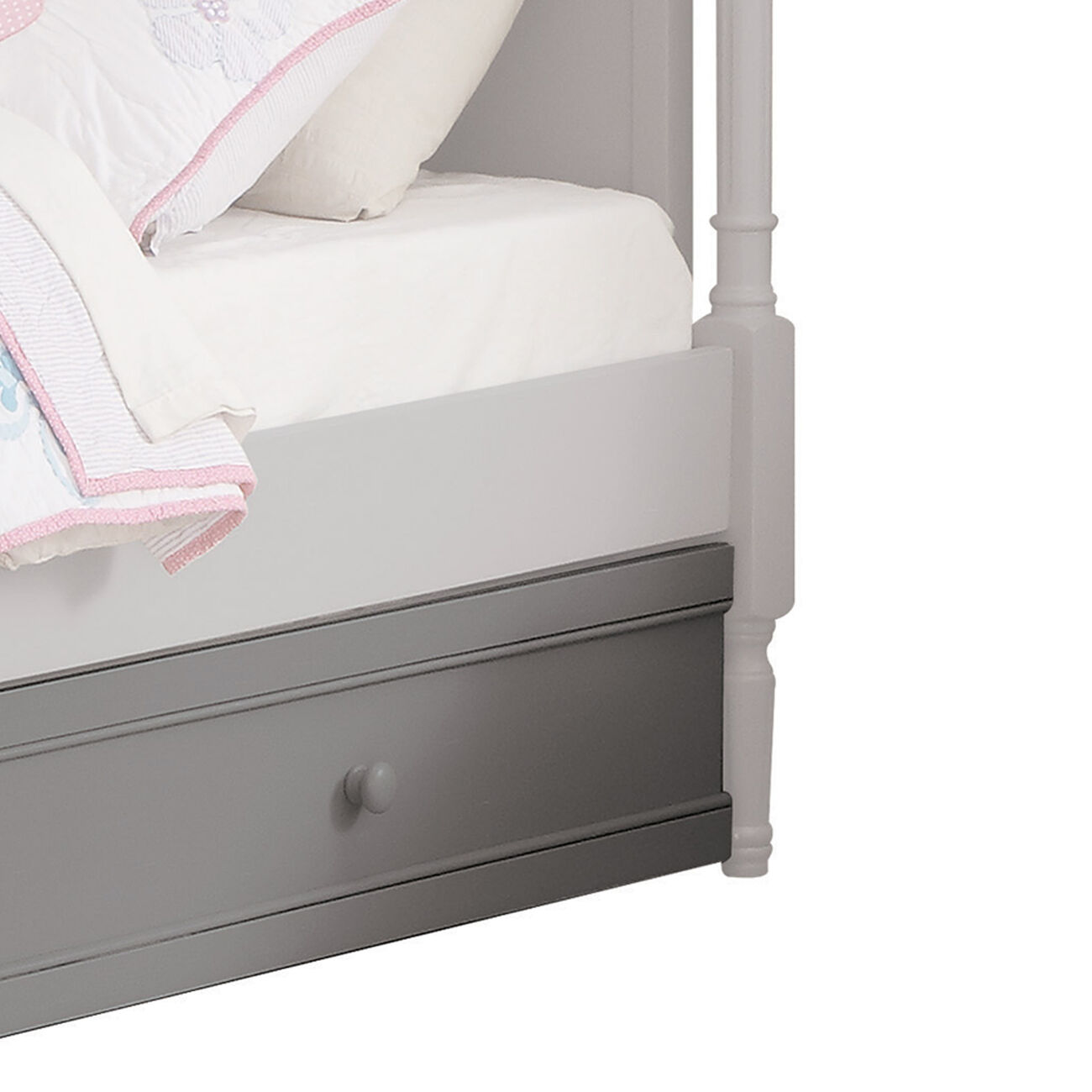 Whether you are looking for space saving design or essentially fun and alluring plans for your child's room, this twin size trundle is what you are searching for. The trundle is made up of wood and it is finished in antique gray color that is sure to coordinate an assortment of stylistic layouts in your bedroom. It rests on caster wheels that allow it to slide out easily from under the bed and it features drawer imitation face with two knobs.