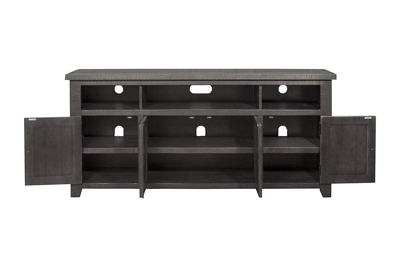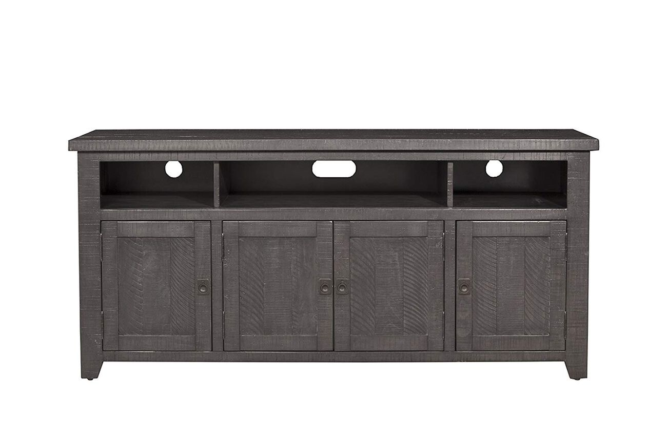 Painted on an unlabeled frame, the tv stand showcases rough-hewn saw and distressed marks throughout the structure. Made from pine and pine veneer, the gray tv stand features 3 spacious open shelves along with a total of 4 doors that gives a closed storage shelter to your expensive media accessories.