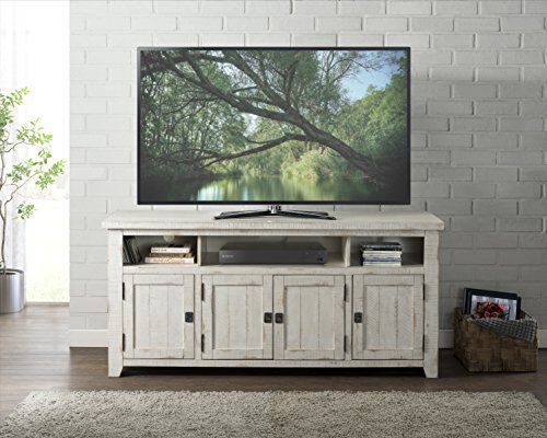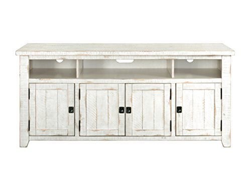 Painted on an unlabeled frame, the tv stand showcases rough-hewn saw and distressed marks throughout the structure. Made from pine and pine veneer, the white tv stand features 3 spacious open shelves along with a total of 4 doors that gives a closed storage shelter to your expensive media accessories.