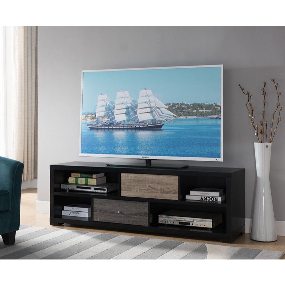 Bring organizational appeal and a touch of contemporary flair to your home with this sleek and sophisticated media console. Showcasing a clean-lined design and black finished frame, this simply stylish tv stand lets your television take all the focus while providing you with ample space for your media accessories. The four open shelves of varying size can accommodate many electronic devices, and there is a wire cutout in the back that provides easy wiring access. The two drawers one in dark taupe brown and other in distressed gray can be use to store dvds, games, excess wires and more. Try topping this lovely console with your flat screen tv and set it against an empty wall in your living room.
