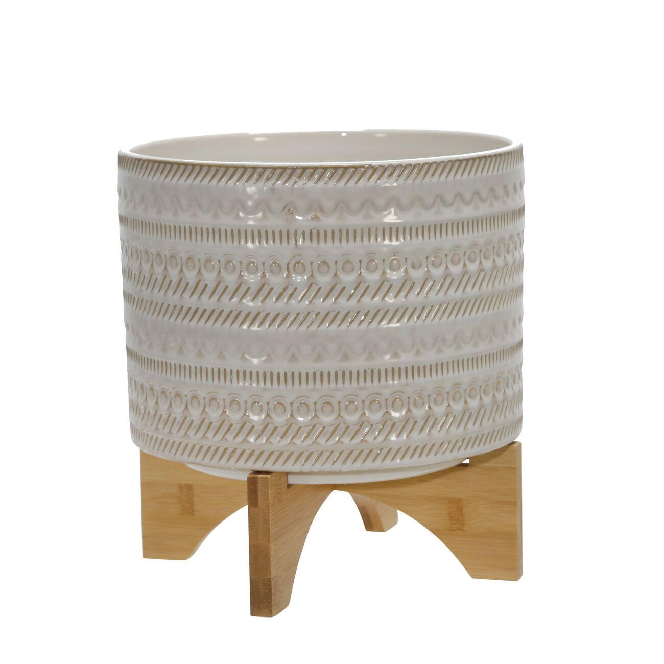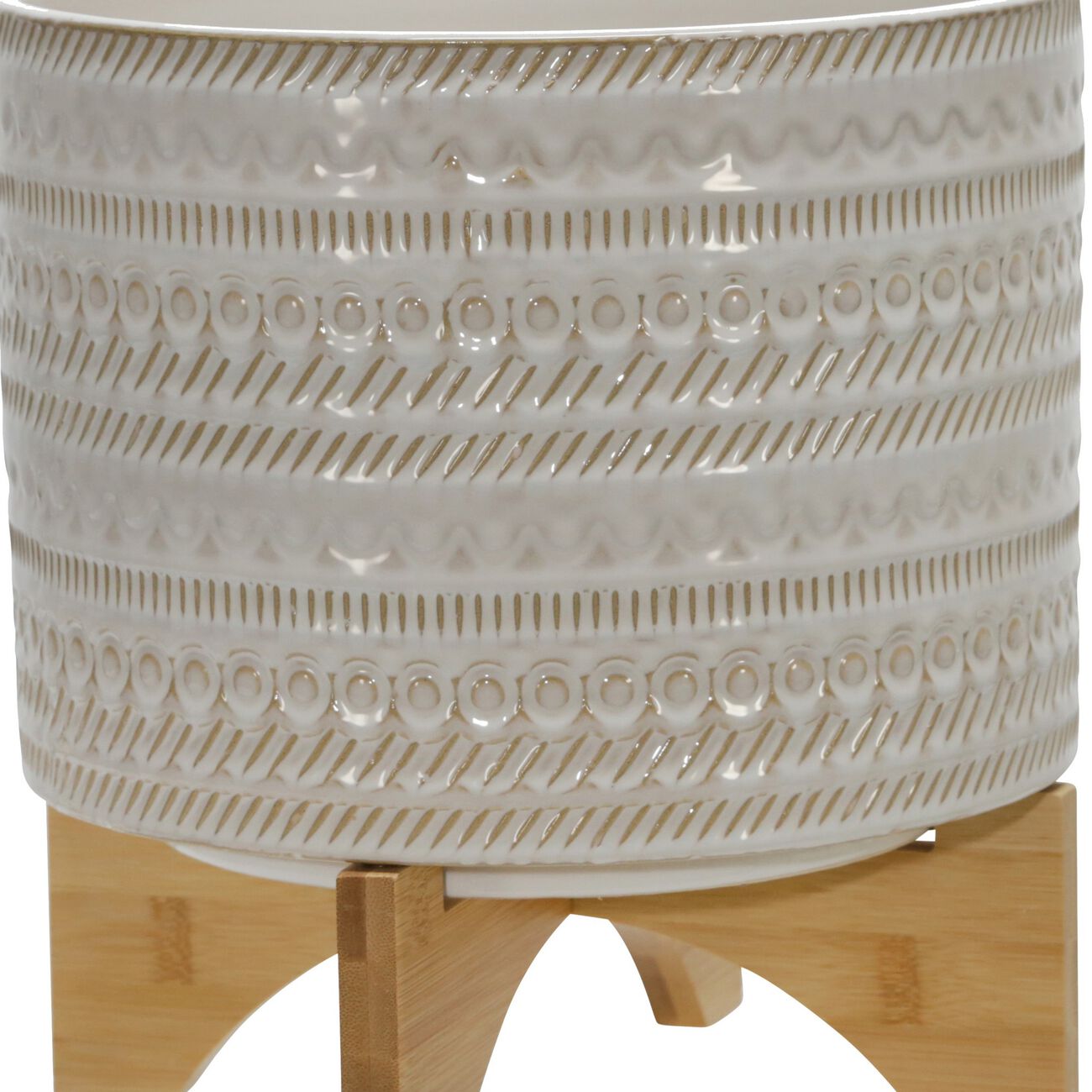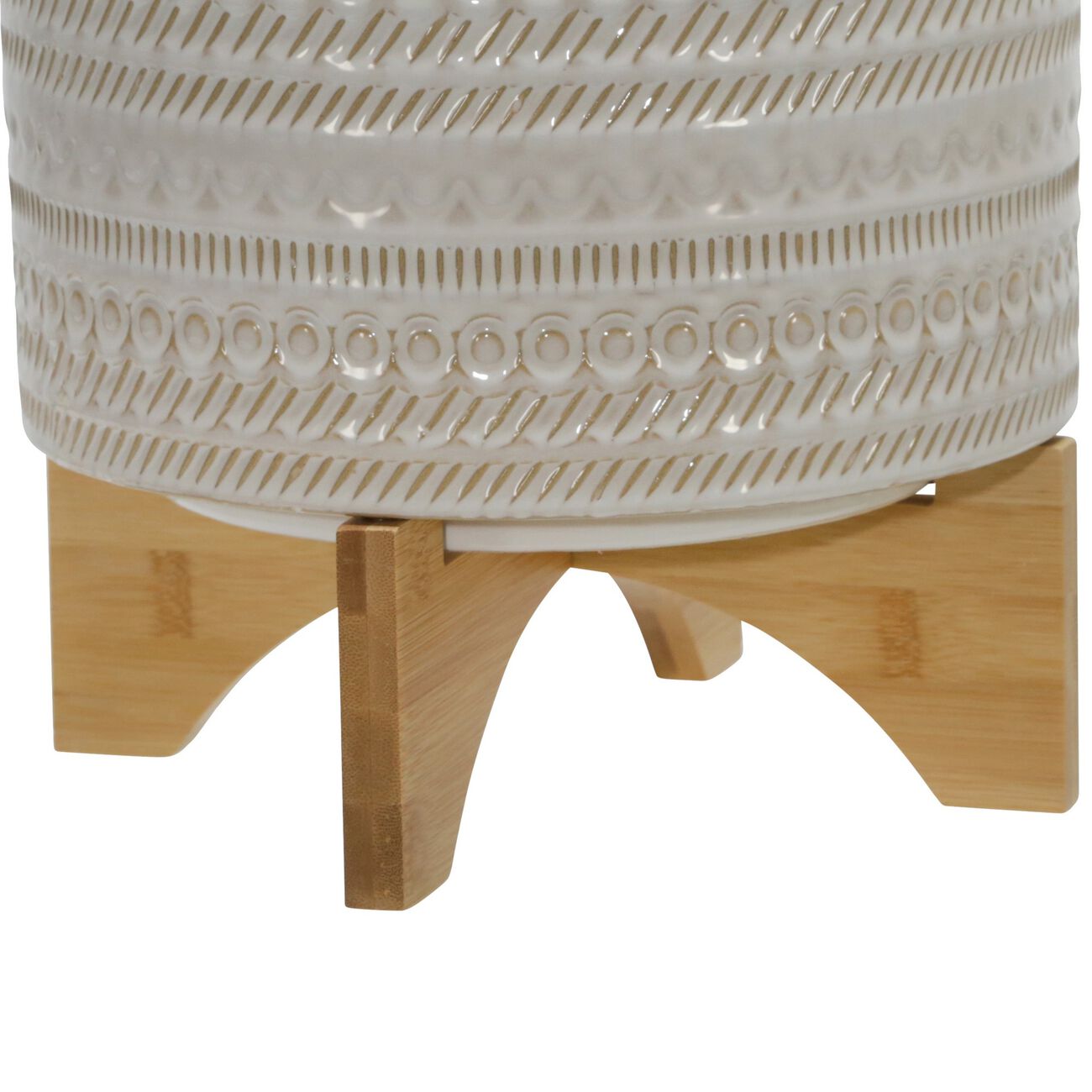 11 Inch Ceramic Textured Planter with Wooden Base, White and Brown