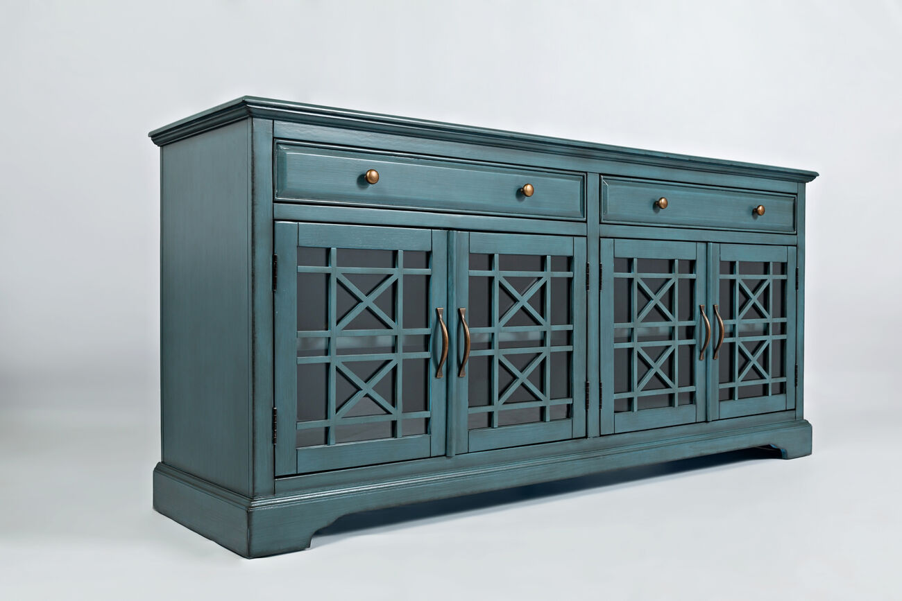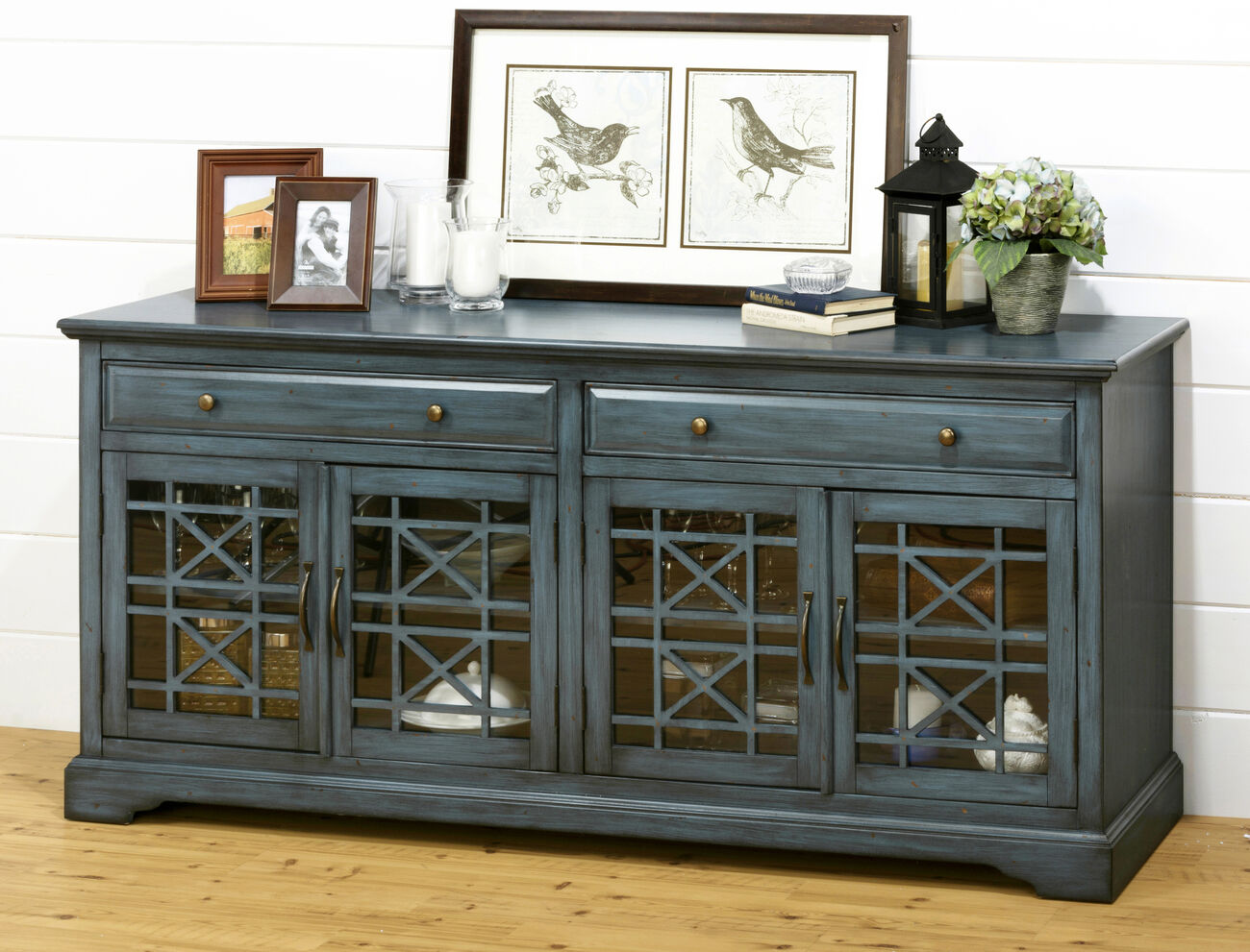 The perfect pairing of convenient storage space and farmhouse-inspired style, this craftman series 70 inch media unit is a welcome addition in any ensemble. Constructed from wood that offers durability and finished in antique blue tone, this will blend effortlessly into your existing decor. Built to support tvs up to 70 inches, the media unit features two drawers and two storage cabinets with fretwork design glass doors that open to reveal shelves inside to let you stow your media equipment, game consoles, and other components.