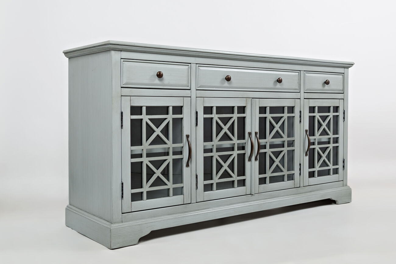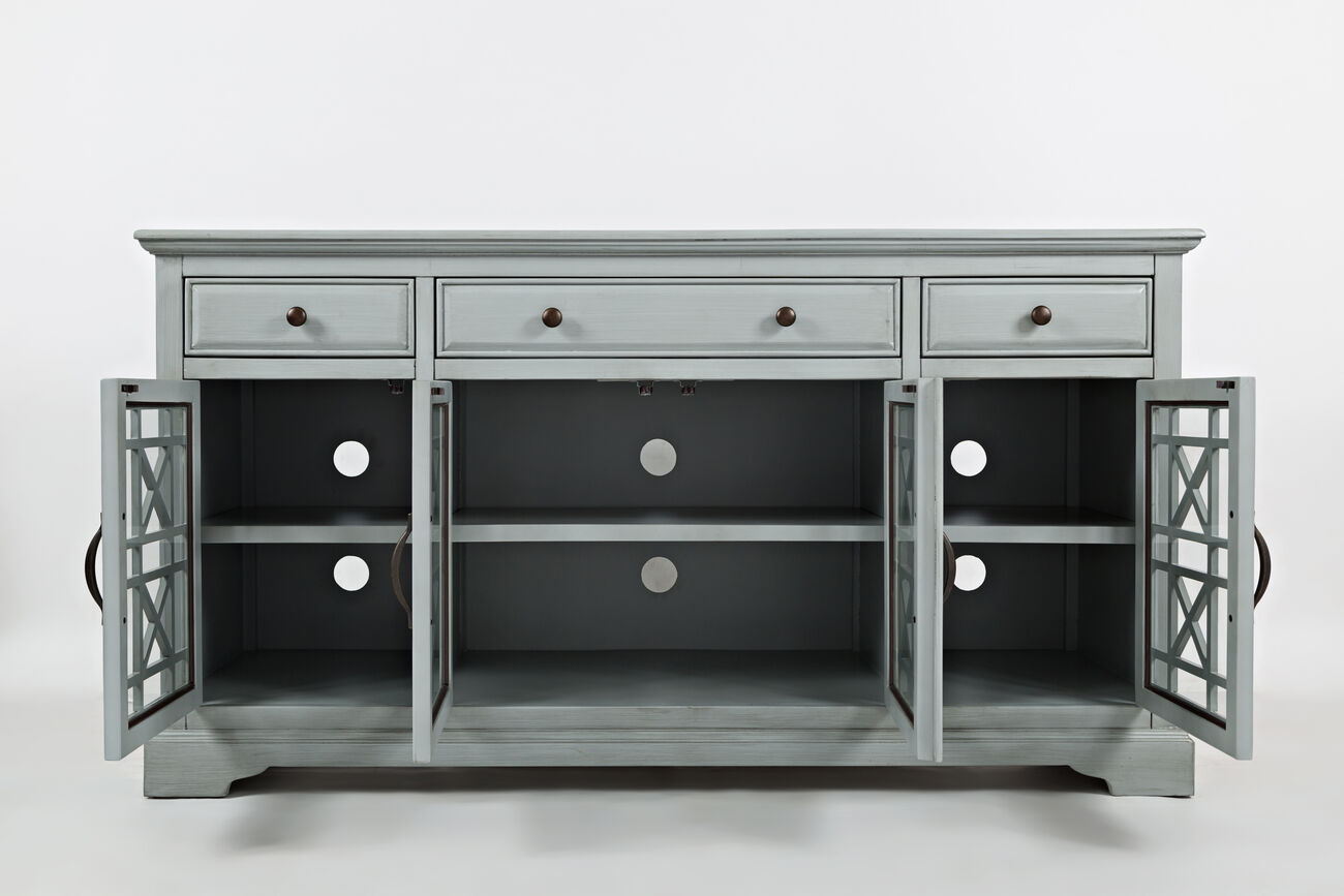 A stunning combination of color and pattern, this deliberately designed craftman series media unit will give the classic look to your living room. Sturdily made up of wood, this media unit is complemented with an earl gray finish which blends perfectly with your existing decor. With modest design and spacious storage options, this media unit features three drawers and three cabinets with interior storage shelves and fretwork detailing over the glass doors. Its sturdy and rigid structure can support a tv up to 60 inch in size.