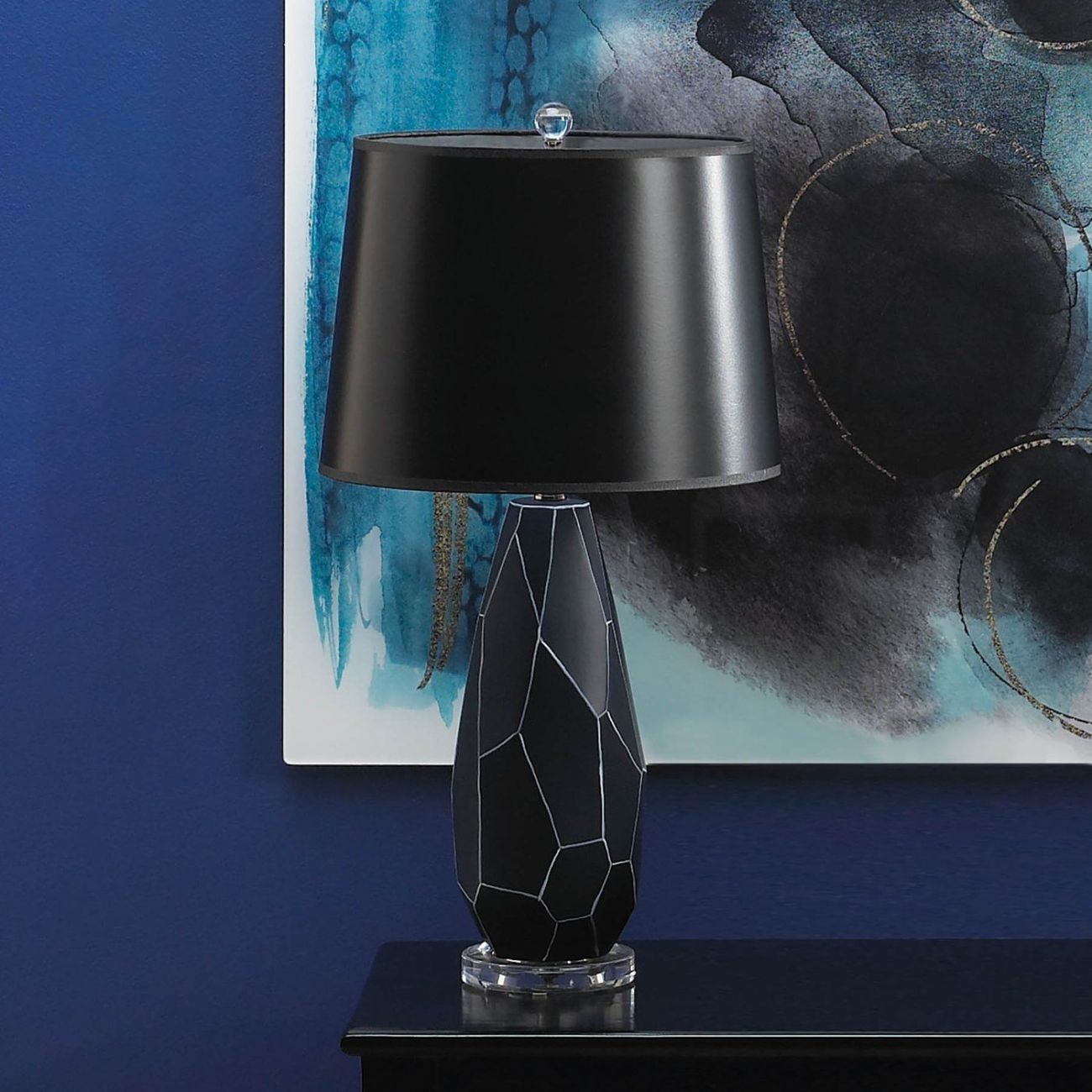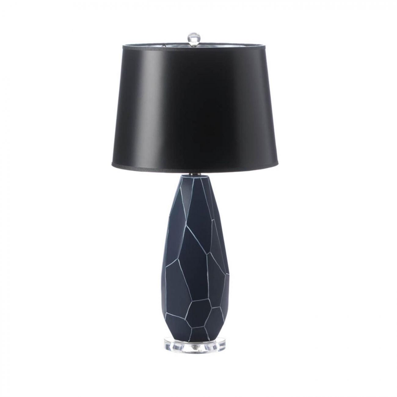 The Igrit Gem Table Lamp shows its beauty in the details with a gorgeous geometric base in dark blue and a sleek black shade. Geometric oval gem base in rich blue. Black paper lamp shade. Clear acrylic stand and lamp finial.
